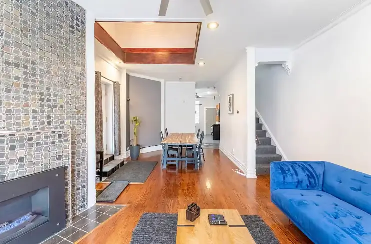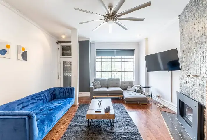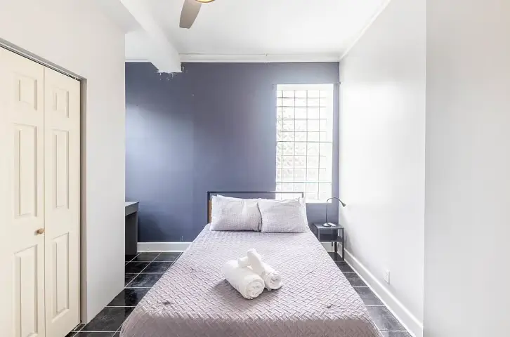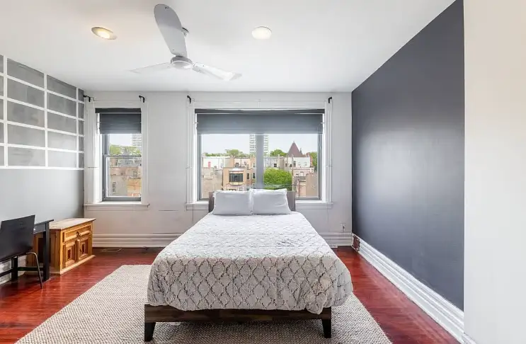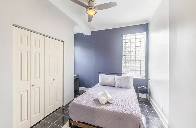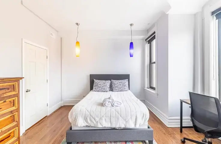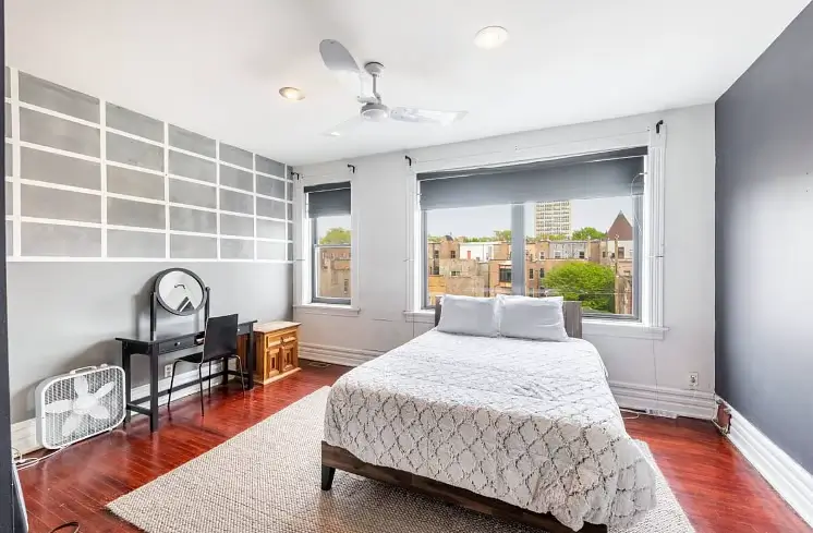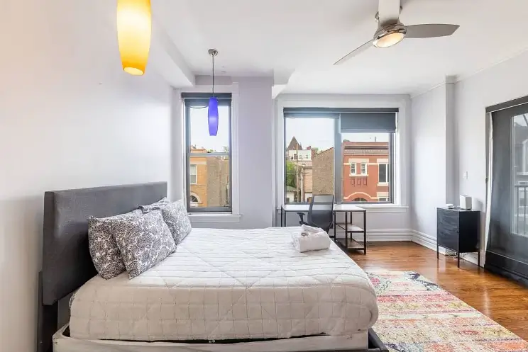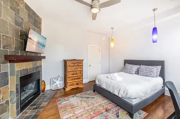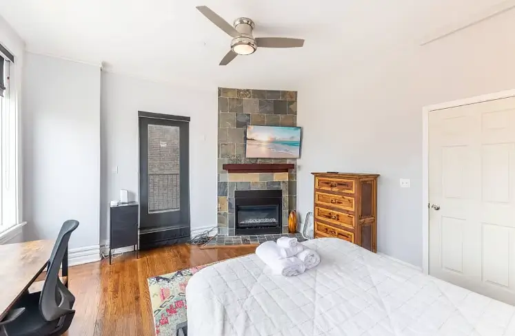 Enjoy your new haven in this charming Chicago, Illinois home, where comfort meets convenience in a vibrant neighborhood. This beautifully appointed house boasts four generously sized bedrooms, each thoughtfully designed to be your retreat. The first bedroom is a cozy sanctuary featuring a queen-sized bed, smart TV, fireplace, and all the essentials to make you feel at home. Each bedroom, from queen to full-sized beds, is uniquely equipped with dressers, desks for your work or study needs, and ceiling fans to keep you comfortable all year round.