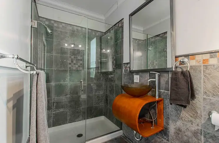 Living spaces are designed for relaxation and entertainment with cozy couches, a smart TV, and a fireplace that adds warmth to any gathering. The dining area, welcoming up to six guests, is perfect for intimate dinners or casual meals.